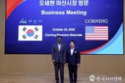 한국시사경제 충남취재본부 | 아산시는 24일 글로벌 첨단 유리소재 선도기업인 코닝정밀소재㈜를 방문해 임직원들과 간담회를 갖고 지역경제 활성화와 상생협력 방안을 논의했다고 밝혔다. 이번 방문은 코닝정밀소재의 생산 현장을 직접 둘러보고, 최근 디스플레이 산업의 기술 변화와 기업 애로사항을 청취하며 지역 산업 생태계와 연계한 협력 방안 및 지역경제 회복 방향을 모색하기 위해 마련됐다. 간담회에는 오세현 시장을 비롯해 이재성 기획경제국장 등 시 관계자와 반 홀(Vaughn M. Hall Jr.) 코닝정밀소재 대표이사와 임원진 등 20여 명이 참석했다. 양측은 △코닝의 첨단 건축용 유리제품 공공건축물 적용 △아산시 관내 기업 이용 및 청년 현장견학 프로그램 운영 △아산페이 더블혜택 이벤트 홍보 △지역 농산물 이용 등 다양한 상생 협력 과제에 대해 의견을 교환했다. 이 자리에서 오 시장은 “디스플레이 산업은 초고해상도, 대형화, 폴더블 등 기술 패러다임이 빠르게 전환되고 있으며, 그 중심에 코닝의 초박막‧고기능성 유리 기술이 있다”고 평가했다. 특히 “코닝정밀소재는 아산의 미래산업을 함께 설계하는