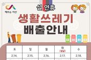 한국시사경제 충남취재본부 | 충남 서산시는 설 명절을 맞아 귀성객과 시민들이 쾌적하게 명절을 보낼 수 있도록 “설 명절 쓰레기 관리 대책”을 2월 2일부터 18일까지 추진한다고 밝혔다. 시에 따르면 관리 대책으로 추진되는 사항은 ▲설맞이 환경정화활동 ▲설 연휴 생활 쓰레기 수거 및 일정 안내 ▲환경종합상황실·기동처리반 운영 등이다. 먼저, 시는 설 명절 전 깨끗한 도시 환경을 조성하기 위해 2월 13일까지 공직자, 지역사회 기관·단체와 함께 관내 전 지역을 청소하는 ‘설맞이 환경정화활동’을 추진한다. 이번 대청소는 귀성객에게 쾌적한 귀성길과 생활 환경을 제공하기 위해 관내 도로변과 유동 인구가 많은 지역을 중심으로 진행된다. 설 연휴 쓰레기 수거 일정은 2월 17일부터 18일까지 2일간은 생활 쓰레기가 수거되지 않으며, 그 밖의 기간에는 정상적으로 수거될 예정이다. 연휴 기간 시민들은 2월 16일과 17일을 제외한 기간에 저녁 8시 이후부터 기존 배출 장소에 생활 쓰레기를 배출하면 된다. 시는 설연휴 생활 쓰레기 수거 일정을 2월 13일까지 서산시 누리집, 중앙호수공원 전광