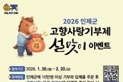 한국시사경제 권충언 기자 | 인제군은 2026년 설 명절을 맞아 고향사랑기부제 참여 확산을 위한 특별 이벤트를 오는 1월 26일부터 2월 20일까지 진행한다. 이번 이벤트는 인제군에 10만 원 이상 기부하고, 고향사랑e음 또는 위기브를 통해, 주문한 답례품 후기를 작성하면 자동으로 응모되는 방식으로 운영된다. 응모자 가운데 추첨을 통해 30명을 선정해 강원한우 사골곰탕 선물세트를 제공하며, 당첨자는 2월 23일 이후 개별 문자로 안내할 예정이다. 기부는 온라인 플랫폼인 고향사랑e음과 위기브, 또는 전국 농협은행·농축협 지점을 통해 가능하다. 군은 이번 이벤트를 통해 고향사랑기부제에 대한 인지도를 높이고, 명절을 계기로 기부 참여를 확대해 지역경제 활성화로 이어간다는 계획이다. 김장웅 인제군 지역발전과장은 “설 명절을 맞아 고향을 응원하는 마음이 자연스럽게 기부로 이어질 수 있도록 이번 이벤트를 마련했다.”며 “고향 사랑기부제가 지역에 실질적인 도움이 되는 제도인 만큼 많은 관심과 참여를 바란다.”고 말했다. 한편, 고향사랑기부제는 개인이 주소지 외 지방자치단체에 기부할 경우
