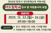 한국시사경제 권충언 기자 | 원주시 평생교육원 학습관에서 12월 22일부터 26일까지 2026년 원주시 성인문해교육 지원사업 '더드림학교' 강사 및 자원봉사자를 모집한다. 이번 문해교육 강사는 학령기 교육의 기회를 놓친 비문해 성인을 대상으로 더디딤 6개반, 더채움(성인생활문해) 5개반, 더열림(찾아가는 성인문해교실) 3개반, 더터치(디지털문해) 5개반 등 전문적인 문해교육을 수행할 교육강사 19명, 자원봉사자 19명, 총 38명을 모집한다. 지원자는 신청서를 작성해 평생교육원 학습관에 방문 접수하면 되고, 선발은 1차 서류 심사와 2차 면접 및 수업 시연으로 이루어진다. 심사에서는 ▲강사 경력 및 자격 ▲강좌 운영 적합성 ▲지원자의 전문성 ▲강의 계획의 적정성 ▲강의 능력 등을 종합적으로 평가해 최종 합격자를 선정한다. 윤석재 학습관장은 “비문해 어르신들에게 질 높은 문해교육을 제공하여 학습자들의 자존감 향상에 기여할 역량 있는 강사와 자원봉사자의 많은 관심과 참여를 기대한다.”라고 말했다.