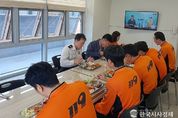 한국시사경제 오영주 기자 | 김문용 대전소방본부장은 21일 둔산소방서 태평119안전센터를 방문해 현장 대원들과 함께 구내식당에서 소통의 시간을 가졌다. 이번 방문은 현장 근무 대원들이 이용하는 구내식당의 운영 현황을 점검하고, 일선에서 활동 중인 소방대원들의 애로사항과 건의사항을 직접 청취하기 위해 마련됐다. 이날 김 본부장은 식사와 함께 식단 구성, 위생 관리, 시설 환경 등 급식 운영 전반에 대한 의견을 나누며, 현장의 목소리를 세심하게 경청했다. 김문용 본부장은 “건강하고 균형 잡힌 식사는 소방대원의 체력 유지와 안전한 현장 활동의 기본”이라며 “대원들이 만족할 수 있는 급식 환경 조성을 위해 현장의 의견을 적극 반영해 나가겠다”라고 말했다. 이어 “여러분의 목소리가 조직 발전의 원동력”이라며 “앞으로도 지속적인 소통을 통해 근무 여건과 복지 향상을 위한 노력을 이어갈 것”이라고 덧붙였다.