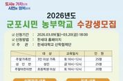 한국시사경제 사회팀 | 군포시 도시농업 활성화 지원사업 보조사업자인 한세대학교가 오는 3월 20일까지 2026년도 군포시민 농부학교 신규 수강생을 모집한다고 밝혔다. 군포시민 농부학교는 군포시민들이 도심 속에서 직접 작물을 재배하며 친환경적인 삶의 태도를 함양하고, 이웃과 소통하는 공동체 문화를 회복하기 위해 마련됐다. 특히 단순한 농사 기술 습득을 넘어 이론과 실습이 병행된 체계적인 커리큘럼을 제공할 예정이다. 올해 모집 규모는 성인반 25구좌, 주말가족반 25구좌, 주말어린이반 20구좌로 총 70구좌이며, 교육은 한세대학교 내 위치한 도시농업지원센터 전용 농장에서 진행된다. 운영 기간은 3월부터 12월까지 약 10개월간이며 총 20강에 걸쳐 절기별 작물 재배법과 생태 교육 등 다채로운 프로그램이 이어진다. 신청 접수는 3월 9일부터 3월 20일까지 진행되며 자세한 커리큘럼 및 접수 방법은 한세대학교 홈페이지 공지사항을 통해 확인할 수 있다. 군포시 관계자는 “도시농업은 먹거리를 생산하는 즐거움을 넘어 기후 위기 시대에 탄소 중립을 실천하는 소중한 발걸음이 될 것”이라며 “많은 시민이 흙을 만지며
