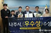 한국시사경제 권충언 기자 | 전라남도 나주시가 교육부 주관 ‘제22회 대한민국 평생학습대상’에서 환경과 자원순환 학습을 생활 속 실천으로 확산한 성과를 전국적으로 인정받았다. 나주시는 지난 1일 정부세종컨벤션센터에서 열린 ‘제22회 대한민국 평생학습대상’ 시상식에서 ‘우수상’을 수상했다고 2일 밝혔다. 이번에 수상한 ‘에코브릿지 Project’는 경력단절여성, 청소년, 장애인, 어르신 등 다양한 계층을 대상으로 재활용, 분리배출 교육과 미디어아트 융합 체험을 운영해 시민들의 자발적 참여와 생활 속 실천을 끌어낸 혁신적 평생학습 프로그램으로 평가받았다. 대한민국 평생학습대상은 전국 지자체와 기관 및 단체의 우수 사례를 발굴하고 확산하기 위해 2004년부터 매년 개최되는 국내 최고 권위의 평생학습 시상제도다. 나주시는 지난 2022년 제19회 대회 우수상 수상에 이어 올해 다시 한번 성과를 거두며 ‘시민 모두가 배우고 실천하는 학습공동체’로서의 위상을 공고히 했다. 윤병태 나주시장은 “이번 수상은 평생학습을 통해 지속 가능한 지역 발전을 만들어가는 나주시민 모두의 성과”라며 “평생학습 기반