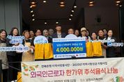 한국시사경제 전북취재본부 | 남원시가족센터는 지난 10월 2일 고유 명절인 추석을 맞이하여 관내 외국인근로자를 대상으로 음식나눔 행사를 실시했다. 이번 외국인근로자 추석음식 나눔은 JB금융그룹 전북은행 지역사랑성금 400만원을 지원받아 진행됐다. 남원시가족센터에서는 2016년부터 외국인 근로자를 대상으로 한국어 교육을 실시해 왔으며, 현재는 8개반 37명이 한국어 교육 서비스를 받고 있다. 또한 남원시가족센터는 외국인지원센터를 운영하여 증가하는 외국인 주민들의 안정적인 정착을 돕고, 지역사회의 일원으로서 통합을 지원하기 위한 다양한 체류 지원 서비스를 제공하고 있다. 이번 명절 한가위 음식나눔 꾸러미는 찰밥, 산적, 떡, 과일, 생활용품으로 구성되어 있으며, 다양한 국가(캄보디아, 미얀마, 네팔, 스리랑카, 방글라데시 등)의 근로자 70명에게 전달됐다. 나찬도 센터장은 “다문화가족과 지역민, 그리고 센터가 삼위일체가 되어 서로 소통하고 이주민들의 한국 사회정착을 적극적으로 지원하고 함께하는 센터가 되도록 적극적으로 수행해 나가겠다”라고 소감을 밝혔다. 여성가족과 김미옥과장은