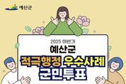 한국시사경제 충남취재본부 | 예산군은 2025년 하반기 적극행정 우수공무원 선발을 위해 4월 1일부터 7일까지 7일간 온라인 군민투표를 실시한다고 밝혔다. 군은 적극적인 업무 추진으로 공공의 이익 증진에 기여하고 공직사회에 적극행정 문화를 확산하기 위해 매년 상하반기 적극행정 우수공무원 선발을 추진하고 있다. 군민투표는 1차 내부 실무평가단 심사를 통과한 적극행정 사례 18건 중 2건에 투표하는 방식으로 진행되며, 정보무늬(QR코드) 접속 또는 군 누리집 ‘군민참여-설문조사’ 코너에서 본인인증 후 참여할 수 있다. 군은 실무심사와 군민투표, 적극행정위원회 심사 점수를 합산해 4월 중 적극행정 우수공무원을 선발하고 인사상 우대 조치와 함께 포상금을 지급할 계획이다. 군 관계자는 “현장의 다양한 목소리를 정책에 반영하고 적극행정을 더욱 활성화하기 위해 우수공무원 선발에 많은 관심과 참여를 부탁드린다”고 당부했다.