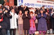 한국시사경제 사회팀 | 이재준 수원특례시장은 1일 아침 팔달산 서장대에서 시민들과 함께 해맞이를 하고, “시민 여러분께서 소망하시는 모든 것을 성취하시길 기원하겠다”고 말했다. 이재준 시장은 “올해도 시민 여러분과 함께 수원을 더 새롭고, 더 빛나게 만들기 위해 노력하겠다”며 “모든 시민이 수많은 역사와 희망을 만드는 멋진 한 해가 되길 바란다”고 기원했다. 서장대 일원을 가득 메운 시민들은 떠오르는 해를 보며 함께 소원을 빌었다. 수원시는 12월 31일 저녁부터 1월 1일 아침까지 일원에서 시민들과 함께하는 송년·신년 행사를 열었다. 12월 31일 밤 10시 30분부터 행궁광장 특설무대에서 ‘제야음악회’가 열렸다. 자정에는 여민각에서 제야 타종 행사를 열고 2026년 병오년(丙午年)의 시작을 알렸다. 이재준 시장, 이재식 수원특례시의회 의장, 김영진(수원시병)·김준혁(수원시정) 의원, 시민 대표 등이 타종했다. 이재준 수원시장과 김현수 제1부시장, 4개 구청장, 실·국장 등은 1일 오전 9시 현충탑을 참배했다.