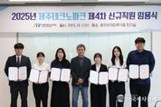 한국시사경제 한장선 객원기자 | 제주테크노파크(원장 지영흔, 제주TP)가 1일 제주벤처마루 9층 회의실에서 6명의 신규직원에게 임명장을 수여했다. 이번 신규직원은 지난 6월 실시된 제주특별자치도 공공기관 통합공채에 따른 채용이다. 제주TP는 통합공채를 통해 기업육성과 바이오, IT 분야, 우주항공, 경영지원 등 제주 주축산업과 미래 신산업 육성에 필요한 지역인재 10명을 모집했다. 그 결과 기업육성을 위한 사업기획을 비롯해 용암해수 활용과 생산장비 운영, 빅데이터센터와 관련한 미래신산업, 경영지원 분야에서 6명이 채용됐다. 제주TP는 매년 제주특별자치도에서 실시하는 공공기관 통합채용에 참여하며 청년일자리 창출에 기여하고 있다. 현재 제주TP는 정책기획단과 기업지원단, 청정바이오사업본부 산하 바이오센터와 생물종다양성연구소, 용암해수센터, 미래융합사업본부 산하 미래산업센터와 에너지센터에 정규직 146명 포함 188명의 전문직이 근무하고 있다. 한편 제주TP는 중소벤처기업부와 제주특별자치도의 지원‧감독을 바탕으로 산학연관 협력네트워크를 구축하고, 지역 특성에 맞는 산업발전 전략과 정책의 수립, 연구개발