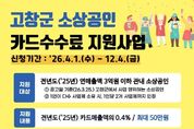 한국시사경제 김숙영 기자 | 고창군이 관내 소상공인의 경영 부담 완화를 위해 오는 4월1일부터 예산 소진 시까지 ‘2026년 소상공인 카드수수료 지원사업’을 본격 추진한다고 밝혔다. 이번 사업은 전년도 연매출 3억원 이하 고창군 소재 소상공인을 대상으로 하며, 카드 매출액의 0.4%에 해당하는 카드수수료를 최대 50만원까지 지원한다. 특히, 해당 사업은 도비와 군비를 포함해 업체당 최대 30만원까지 지원되는 가운데, 고창군은 군비 20만원을 추가로 투입해 도내 타 시·군보다 확대된 최대 50만원까지 지원한다. 최근 중동 정세 등 대외 경제 불안에 따른 경기 침체와 소비 위축으로 어려움을 겪는 지역 소상공인의 경영 여건을 고려해 전년보다 1개월 앞당겨 조기 시행하며, 실질적인 경영 부담 완화에 중점을 두었다. 신청을 희망하는 소상공인은 사업장 소재지 읍·면 주민행복센터를 방문해 신청할 수 있으며, 자세한 사항은 고창군청 홈페이지 공고문을 통해 확인할 수 있다. 고창군수는 “소상공인은 지역경제의 근간이고, 이들의 회복이 곧 지역의 활력이다”며, “이번 지원사업이 경기침체로 어려움을 겪는