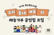 한국시사경제 사회팀 | 북수원·대추골·일월도서관은 시민 참여 문화공연 ‘우리동네 예술 터’에 참여할 재능기부 공연팀을 4월 30일까지 모집한다. 모집 대상은 수원시 예술 동아리와 단체, 예술인으로 개인과 단체 모두 신청할 수 있다. 모집 분야는 ▲음악 ▲무용 ▲연극 등 다양한 장르의 공연이며, 지역 주민과 함께 나눌 수 있는 재능기부 형태의 공연이어야 한다. 정치적·종교적·영리 목적의 공연은 제외한다. 선정된 공연팀은 5월부터 12월까지 북수원·대추골·일월도서관 강당 등에서 공연할 수 있으며, 도서관은 공연 공간을 제공한다. 수원시 관계자는 “이번 사업은 이웃의 재능을 나누며 도서관을 소통의 공간으로 만드는 데 의미가 있다”며 “지역 예술인에게는 무대를, 시민에게는 문화 향유 기회를 제공하는 만큼 많은 참여를 바란다”고 말했다.