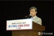 한국시사경제 권충언 기자 | 서울 중구가 제29회 노인의 날(10월 2일)을 기념해 지난 2일 중구 구민회관 대강당에서 기념식과 함께 어르신 어울림 한마당을 열었다. 이날 행사에는 어르신과 내빈 등 500여 명이 참석해 어르신들에 대한 노고에 존경과 감사를 표했다. 1부에서는 노인 복지와 지역 발전을 위해 헌신하신 65세 이상 모범어르신 3명과 노인복지 기여자 9명, 기여 단체 1곳에 표창이 수여됐다. 2부 행사에서는 초대가수 축하공연과 어르신 장기자랑이 펼쳐졌다. 어르신으로 구성된 11팀이 무대에 올라 노래와 악기 연주 실력을 뽐내며 흥겨운 시간을 만들었다. 김 구청장도 '고맙소'라는 노래를 불러 어르신들의 호응을 얻었다. 행사장 로비에는 영양 건강 체험 부스가 마련되어 어르신들이 드신 식사의 칼로리와 나트륨양 등을 직접 계산해보고 균형잡힌 식사법에 대한 상담도 받을수 있었으며, 추척사진관 부스에서는 교복을 입고 사진을 찍으며 옛 추억을 떠올렸다. 행사에는 한국삭도공업주식회사, 대신자산신탁, 한마음라이온스, 중구자원봉사센터를 비롯한 여러 업체와 기관이 경품, 기념품, 간식 등을 후원해 더욱 풍성하