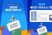 한국시사경제 충남취재본부 | 예산군은 2025년 한 해를 빛낸 주요 성과를 군민과 직원의 투표를 통해 선정하기 위해 ‘2025년 예산군 10대 뉴스 선정’을 추진한다고 밝혔다. 군은 다양한 매체를 활용해 많은 군민이 투표에 참여할 수 있도록 홍보를 강화하고 선정된 10대 뉴스를 통해 군민에게 예산 소식과 주요 정책을 공유할 계획이다. 10대 뉴스 선정은 10일부터 17일까지 온라인을 통해 진행되며, 역점·공약사업과 군민 관심도가 높은 30개 사업을 대상으로 1인 5개를 선택하는 방식으로 이뤄진다. 온라인 투표는 네이버 폼을 활용해 군민과 공무원이 함께 참여할 수 있도록 운영되며, 군은 30개 후보 사업을 확정하고 10일 오후부터 사회관계망(SNS) 등을 통해 군민의 적극적인 투표 참여를 홍보 중이다. 군은 투표 종료 후 19일 최종 10대 뉴스를 선정해 군 누리집 등에 공개할 예정이다. 군 관계자는 “군민과 함께 올 한 해 예산군의 주요 성과를 돌아보고 공유하기 위해 10대 뉴스 선정을 추진하고 있다”며 “군정 발전을 위해 다양한 군민 의견을 반영하는 만큼 많은 참여를 바란다”고 말했