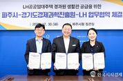 한국시사경제 경기북부취재본부 | 파주시는 30일 경기도경제과학진흥원, 한국토지주택공사 경기북부지역본부와 경과원 파주시 이전에 따른 엘에이치(LH) 공공임대주택 생활관 지원을 위한 업무협약을 체결했다고 밝혔다. 이번 협약은 경과원의 단계적 이전에 앞서 직원들에게 안정적인 정주환경을 제공함으로써 거주지 이전에 따르는 비용 부담을 최소화하기 위한 세 기관간 협력을 강화하는 차원에서 추진됐다. 협약에 따라 한국토지주택공사는 운정신도시 내 공공임대주택 중 보유 공실 일부를 생활관 용도로 활용할 수 있도록 공급 방안을 검토하고, 파주시는 입주 절차와 행정적 지원을 담당한다. 경과원은 대상자 선정과 운영 관리 등 내부 절차를 마련해 실제 입주가 차질 없이 진행될 수 있도록 준비할 계획이다. 김경일 파주시장은 “이번 협약이 파주에 둥지를 틀게 될 경과원 직원들이 걱정 없이 생활할 수 있는 실질적인 지원이 될 것으로 기대한다”라고 말했다. 김현곤 경기도경제과학진흥원장은 “직원들의 주거 부담을 줄이는 것은 이전 성공의 핵심 요소”라며 “세 기관이 함께 만들어가는 협력체계가 앞으로도 좋은 모델이 되길 바란다”라고 전했다. &nbs