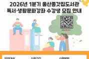 한국시사경제 울산취재본부 | 울산 중구에서 운영하는 울산종갓집도서관이 2026년 1분기 독서·생활문화강좌 수강생을 모집한다 울산종갓집도서관은 오는 1월 27일부터 3월 28일까지 △금융 △외국어 회화 △생성형 인공지능 활용 △독서교육 △미술 △요가 △필라테스 △유아 발레 등 다양한 연령층을 위한 독서·생활문화강좌 25개를 운영할 계획이다. 이번 분기부터 '울산광역시 중구 공공도서관 설치 및 운영 조례' 개정에 따라 독서문화강좌는 무료, 생활문화강좌는 유료로 운영된다. 생활문화강좌 수강료는 분기별로 주 1회 운영 강좌의 경우 15,000원, 주 2회 운영 강좌의 경우 30,000원이다. 재료비는 별도이며 준비물은 개별로 지참해야 한다. 수강생 모집은 오는 1월 20일 오전 10시부터 중구 구립도서관 누리집을 통해 선착순으로 진행된다. 모집 인원은 380여 명으로, 중구 구립도서관 회원 누구나 신청할 수 있다. 자세한 사항은 중구 구립도서관 누리집을 참고하거나 울산종갓집도서관으로 문의하면 된다. 중구 관계자는 “주민들의 수요를 반영해 더욱 내실 있고 알