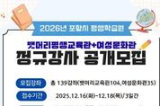 한국시사경제 노승선 기자 | 포항시평생학습원은 2026년도 정규 강좌 운영을 위해 미래사회 변화에 대응할 역량을 갖춘 전문 강사 138명을 공개 모집한다고 2일 밝혔다. 모집 분야별 인원수는 뱃머리평생교육관 일반성인 강좌 58명과 시니어 강좌 30명 및 청소년 강좌 16명, 그리고 여성문화관 정규강좌 34명이다. 자격증·직업능력·문화예술·건강·정보화·외국어·스포츠 등 기존에 수요가 높은 과목뿐 아니라, 지난 11월에 발표된 교육부의 ‘AI for All’ 정책에 맞춰 생애주기별 AI 강좌를 신규 편성해 해당 강사를 모집한다. 또한 고령층을 위한 실버 분야 자격증 강좌를 여성문화관에 새로 개설해 변화하는 학습 수요와 사회적 요구를 반영할 계획이다. 강사 모집 일정은 다음과 같다. 서류 접수는 오는 16일부터 18일까지 방문 접수로 진행되며, 응시자격은 해당 분야의 전문지식과 강의 경험 보유자, 교원자격증 소지자, 관련 자격증 소지자 등이다. 서류합격자는 12월 24일 문자로 개별 통보되고, 최종 합격자는 12월 29일 평생학습원 홈페이지를 통해 발표된다. 자세