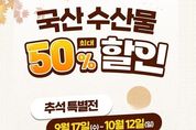 한국시사경제 김숙영 기자 | ■ 온·오프라인으로 국산 수산물 구매시 최대 50% 할인 받으세요 - 9월 17일(수)~10월 12일(일) (오프라인) emart, SAVE ZONE, GS리테일, 농협하나로마트, LOTTE Mart - 총 19개 업체 계산시 자동 할인 적용 (온라인) coupang, Gmarket, CJONSTYLE, kakao, SSG.COM, 11번가 - 총 25개 쇼핑몰 할인쿠폰 발급 후 적용 ■ 수산대전 추석 특별전 할인품목 명태, 고등어, 오징어, 갈치, 참조기, 마른멸치, 김, 전복, 꽃게, 광어 참여업체 등 자세한 내용은 대한민국 수산대전에서 확인하세요! ■ 최대 45% 할인! 추석맞이 민생선물세트 - 손질전복 세트 - 갈치·고등어 세트 - 굴비 세트 - 해품은 김 선물 세트 - 꼬막장 세트 - 참빛멸치 1호 수협쇼핑 또는 오프라인 매장(바다마트)에서 구매할 수 있습니다.