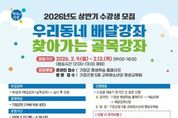 한국시사경제 부산취재본부 | 기장군은 오는 2월 9일부터 12일까지 ‘상반기 우리동네 배달강좌 및 찾아가는 골목강좌’ 수강생을 모집한다고 6일 밝혔다. ‘우리동네 배달강좌’란 학습자가 원하는 시간과 장소에 강좌를 배달하는 평생학습 프로그램이며 ‘찾아가는 골목강좌’는 우리동네 배달강좌의 일환으로, 소외계층을 대상으로 운영되는 평생학습 프로그램이다. 이번 강좌는 ▲교육·학문 ▲어학 ▲건강 ▲음악 ▲미술·공예 ▲컴퓨터·통신 ▲가정·생활 분야 총 60강좌를 모집한다. 수업은 3월 23일부터 5월 29일까지 10주간 운영되며, 대면 수업과 함께 ZOOM 등 온라인 플랫폼을 활용한 비대면 수업을 병행해 학습 편의성과 접근성을 높일 예정이다. 신청대상은 19세 이상 기장군민으로, 대면 강좌는 10인 이상, 비대면 강좌는 7인 이상 학습자를 구성하여 강좌를 신청할 수 있다. 골목강좌는 7인 이상의 학습소외계층(▲기초생활수급자 ▲차상위계층 ▲장애인 ▲다문화·한부모·다자녀가정 ▲남성수강생 ▲직장인)으로만 구성되어야 신청이 가능하다. 신청방법은 기장군 평생학습 홈페이지에서 강사현황을 참고하여 배달강사를 선택한 후 수강