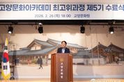 한국시사경제 윤광희 기자 | 지난 26일, 고양문화원에서 열린 ‘고양문화아카데미 최고위과정’제5기 수료식에 이동환 고양시장이 참석해 6개월간의 대장정을 마친 수료생들을 격려하고, 지역 리더로서의 새로운 출발을 축하했다. 지난 2023년 9월 첫발을 뗀 문화아카데미는 이번 5기 수료생을 포함해 현재까지 총 180여 명의 지역 리더를 배출하며, 고양특례시의 지성과 인문학적 통찰을 상징하는 전당으로 확고히 자리 잡았다. 이날 수료식에는 이동환 고양특례시장을 비롯해 선배 수료생 등 100여 명이 참석하여, 배움의 결실을 맺은 5기 수료생들을 아낌없이 축하했다. 이번 문화아카데미 과정에는 기업 CEO, 공직자, 법조인 등 지역사회의 다양한 리더들이 참여해 수준 높은 지적 교류를 나누며 탄탄한 인적 네트워크를 구축했다. 특히 유현준 홍익대 교수, 신병주 건국대 교수, 김민식 세명대 교수 등 국내 최고 수준의 강사진을 통한 이론 강의는 물론, 문화유산 답사와 미술관 견학, 뮤지컬 관람 등 현장 경험을 아우르는 입체적인 융복합 커리큘럼이 진행돼 수강생들에게 큰 호응을 얻었다. 수료식에 참석한 이동환