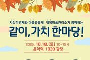 한국시사경제 윤광희 기자 | 가평군은 오는 18일 오전 10시부터 오후 3시까지 음악역 1939 광장에서 주민과 함께하는 축제 ‘2025년 같이, 가치 한마당’을 연다. 이번 행사는 사회적경제기업의 판로 확대와 마을공동체, 경기행복마을관리소의 활동 성과를 알리고 주민 참여를 확대하기 위해 마련됐다. 행사에는 사회적경제기업 5곳, 마을공동체 16곳, 경기행복마을관리소 4곳 등 총 25개 단체가 참여한다. 이날 주민들은 현장에서 직접 사회적경제기업의 제품을 구매할 수 있으며, 공동체별 특색 있는 프로그램을 즐길 수 있다. 주요 프로그램은 △사회적경제기업 생산품 홍보·판매 △공동체와 경기행복마을관리소 활동 전시 및 무료 체험 △합창·뮤지컬 갈라쇼·힐링체조 등 공연 △경품 이벤트 등이 마련돼 있다. 특히 가평마을교육공동체가 제작한 단편영화 상영 등 주민 주도 콘텐츠도 선보일 예정이다. 가평군 관계자는 “‘같이, 가치 한마당’ 축제를 통해 지역사회에서 사회적경제와 공동체 활동이 더욱 확산되기를 기대한다”며 “이번 행사가 지역경제의 활력으로 이어질 수 있도록 주민 여러분의 많은 방문과 성원을 부탁드린다”고 말