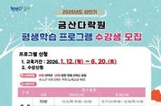 한국시사경제 김태훈 기자 | 금산다락원은 군민 전 계층의 수요를 반영한 2026년 상반기 평생학습 프로그램 수강생 954명을 오는 16일부터 24일까지 모집한다. 이번 프로그램은 아동·성인·노인·문해 총 4분야 76개 강좌가 준비됐으며 내년 1월 12일부터 6월 20일까지 금산다락원 평생학습관에서 진행될 예정이다. 금산다락원·금산군평상학습포털 온라인 신청 기간은 △16~17일 성인(컴퓨터자격증반, 요가 등 36강좌) 분야 △18일~19일 아동(트니트니, 트윈클 영어발레 등 21강좌) 분야이며 접수 이후 잔여 정원에 한해 전화 접수를 운영할 예정이다. 금산다락원 평생학습팀 방문 접수 일정은 △15~19일 노인(실버요가, 전통악기 등 15강좌) 분야 △19일 문해(한글교실 2강좌) 분야 등이다. 노인 분야 강좌는 오는 22일 오전 10시 생명의집 소공연장에서 추첨으로 대상자를 선정한다. 금산다락원 관계자는 “평생학습이 단기간의 교육에 그치는 것이 아니라 지속적인 자기 계발과 학습으로 이어지도록 최선을 다하겠다”고 말했다.