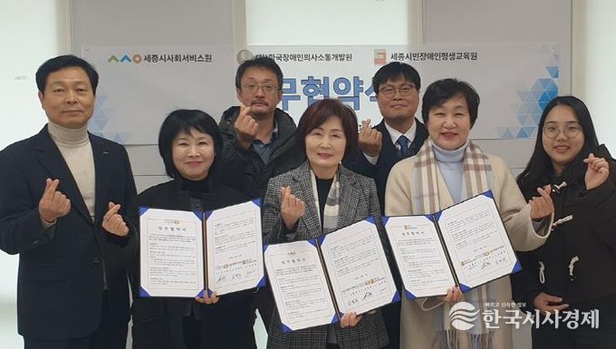 한국시사경제 세종취재분부 | 세종시사회서비스원은 15일, 세종시사회서비스원 회의실에서 한국장애인의사소통개발원, 세종시민장애인평생교육원과 함께 사회적 가치 실현과 장애인의 삶의 질 향상을 위한 업무협약을 체결했다고 밝혔다.