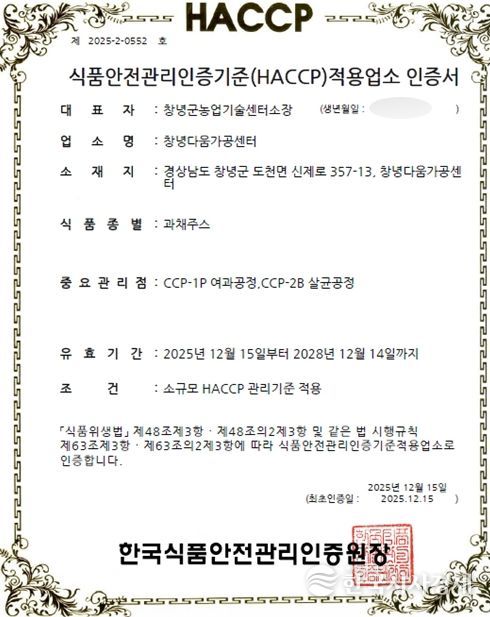 한국시사경제 노승선 기자 | 창녕군은 농업기술센터에서 운영하는 창녕다움가공센터가 한국식품안전관리인증원 식품안전관리인증기준(HACCP) 평가에서 ‘적합’ 판정을 받아 인증을 획득했다고 밝혔다.