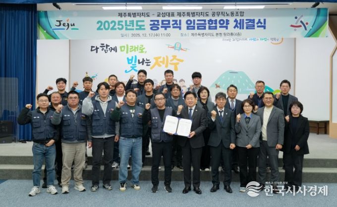 제주도와 교섭대표 노동조합인 제주도 공무직노동조합은 17일 오전 도청 탐라홀에서 ‘2025년도 공무직 임금협약’을 체결했다.