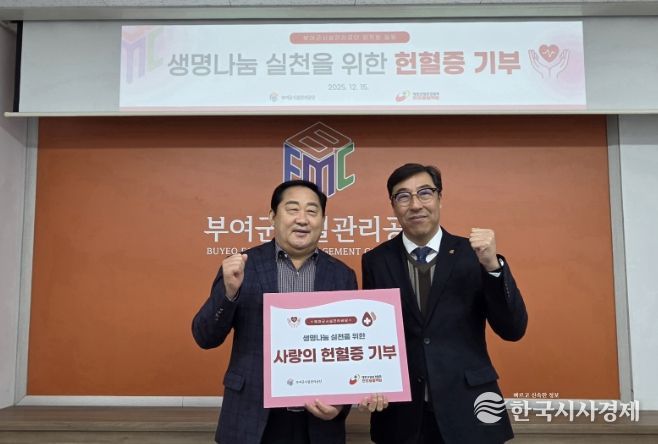 한국시사경제 김태훈 기자 | 부여군시설관리공단은 임직원들이 자발적으로 모은 헌혈증 84매를 대한산업보건협회 한마음혈액원에 기부하며 지역사회 생명 나눔 활동에 동참했다고 18일 밝혔다.