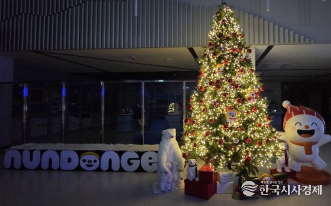 트리는 빨간·골드 오너먼트와 평창군 마스코트 ‘눈동이’로 꾸며졌으며, 북극곰 인형과 기차 모형을 활용한 포토존도 마련했다.