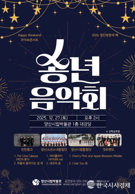 한국시사경제 노승선 기자 | 양산시립박물관은 다사다난했던 한해를 마무리하고 2026년을 희망차게 맞이하고자 오는 27일 오후 2시 시립박물관 대강당에서 ‘송년음악회’를 개최한다.
