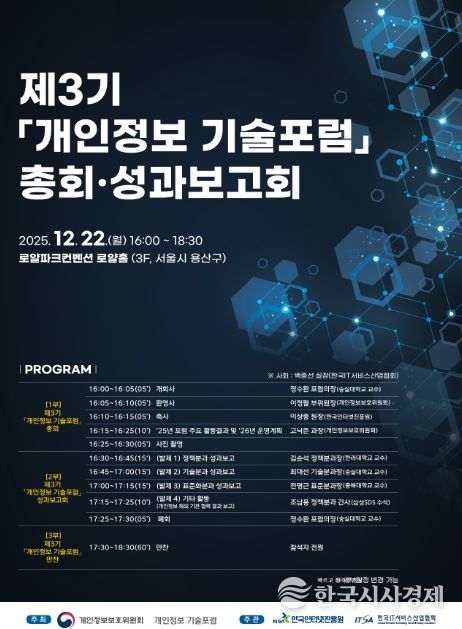 한국시사경제 디지털 뉴스팀 | 개인정보보호위원회는 12월 22일 서울 용산구에서 개인정보 기술개발 활성화 및 산업 생태계 기반 구축을 위한 제3기 '개인정보 기술포럼(의장 정수환 숭실대 교수)' 총회·성과보고회를 개최했다.