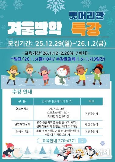 한국시사경제 노승선 기자 | 포항시 뱃머리평생교육관은 겨울방학을 맞이한 청소년과 연초 자기계발을 원하는 시민들을 위해 ‘2026년 겨울 특강 프로그램’을 운영한다.