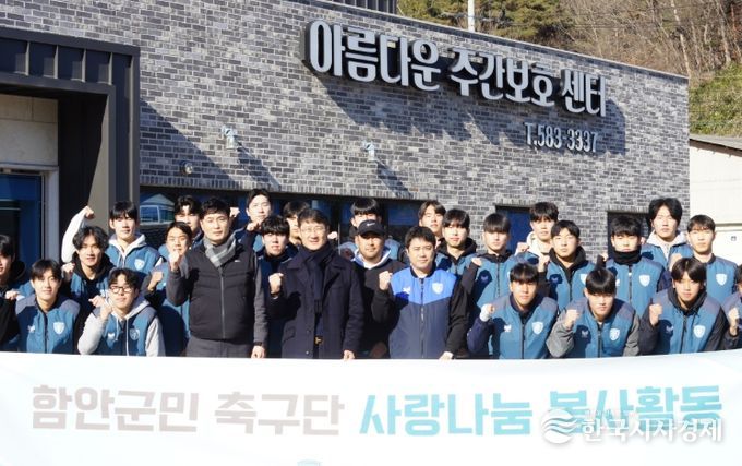 한국시사경제 경남취재본부 | 함안군은 지난 3일 함안군민축구단(단장 전창옥)이 2026시즌 첫 공식 일정으로 가야읍에 있는 ‘아름다운 동산 주간보호센터’에서 사랑 나눔 봉사활동을 진행했다고 밝혔다.