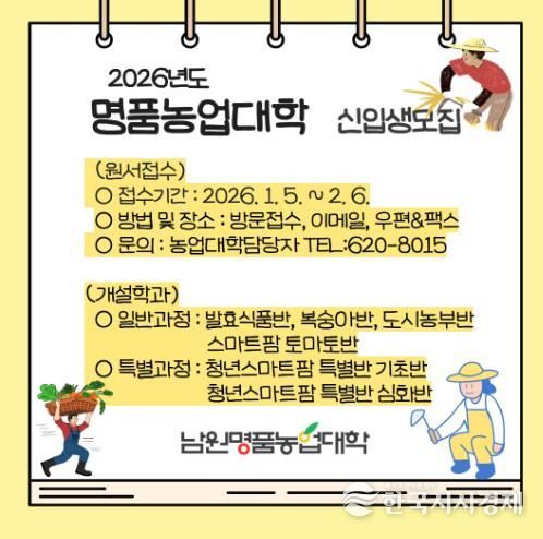 한국시사경제 전북취재본부 | 남원명품농업대학은 2026학년도 신입생 120명을 선발한다고 밝혔다.