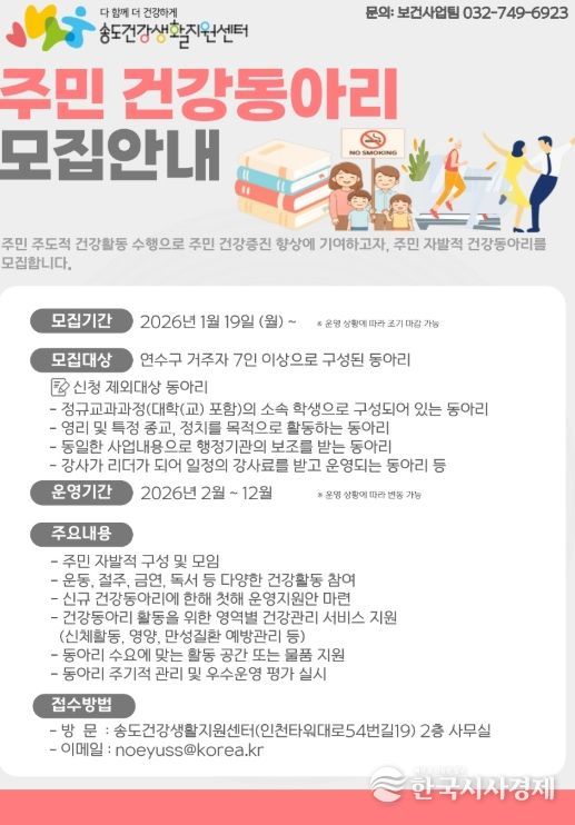 한국시사경제 윤광희 기자 | 연수구 송도건강생활지원센터는 주민들의 자발적인 건강 증진 활동을 지원하기 위해 오는 19일부터 ‘주민 참여형 건강동아리’를 모집한다.