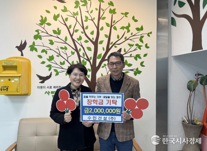 한국시사경제 경북취재본부 | 영주시 수민건설 주식회사(대표 김효식)는 지난 20일 가흥1동 행정복지센터(동장 안순기)를 방문해 새로운 세상을 향해 첫발을 내딛는 예비 대학생을 위한 ‘응원 장학금’ 200만 원을 기탁했다.