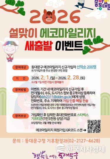 한국시사경제 사회팀 | 동대문구가 '설맞이 에코마일리지 새출발 이벤트'를 2월 1일부터 2월 28일까지 한 달간 운영한다. 설 명절을 맞아 구민의 에너지 절약 실천을 확산하고 에코마일리지 참여를 활성화하기 위함이다.