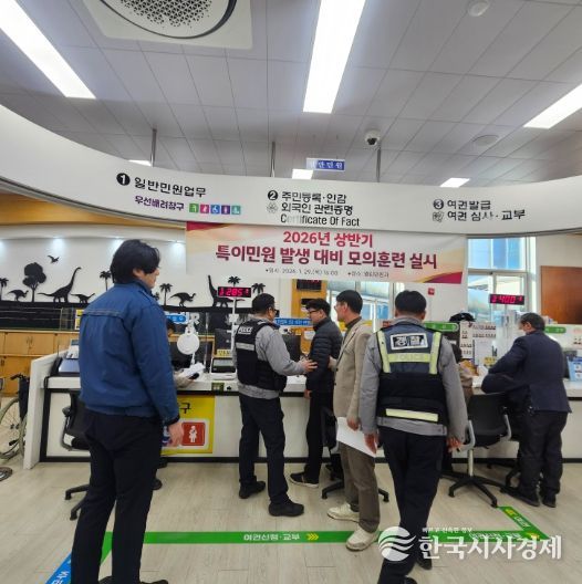한국시사경제 윤광희 기자 | 고성군은 1월 29일 군청 열린민원과에서 고성경찰서와 연계하여'2026년 상반기 특이민원 대응 모의훈련'을 실시했다.