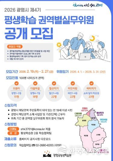 한국시사경제 경기취재본부 | 광명시가 시민 주도의 생활권 중심 평생학습 정책을 강화하기 위해 ‘제4기 평생학습 권역별실무위원회’ 신규 위원 100명을 공개 모집한다.