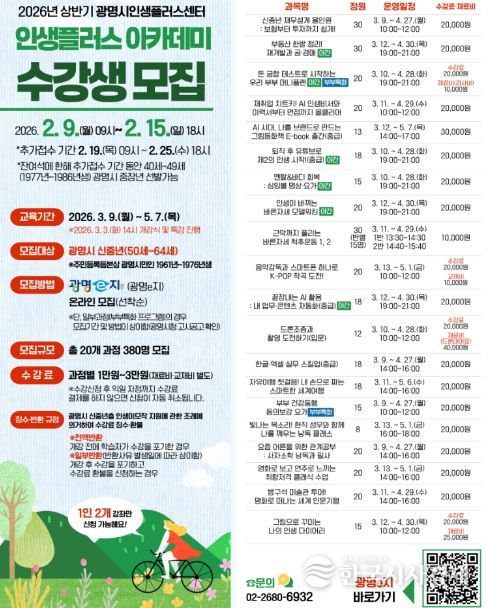 한국시사경제 경기취재본부 | 광명시 인생플러스센터는 신중년의 인생 2막 탐색과 준비를 지원하는 ‘2026년 상반기 인생플러스 아카데미’ 수강생 380명을 오는 9일부터 선착순 모집한다.