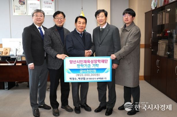 양산시 인재육성장학재단은 지난 5일 박경수((주)양산위생공사 대표)씨와 박선엽(대진기업(주) 대표)씨가 부친의 장례식에 들어온 부조금 2,000만원을 장학금으로 기탁했다고 밝혔다.