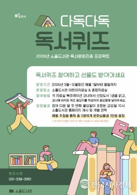 한국시사경제 경기북부취재본부 | 포천시립소흘도서관은 독서 생활화와 지역사회 독서문화 확산을 위해 오는 3월부터 어린이, 청소년·일반을 대상으로 대상으로 ‘다독다독 독서퀴즈’를 운영한다.