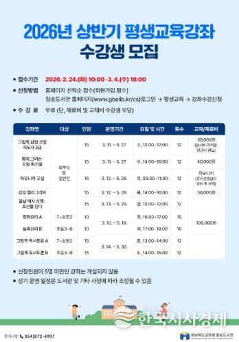 한국시사경제 경북취재본부 | 경상북도교육청 청송도서관은 일상 속에서 배움의 즐거움을 발견하고, 배움으로 삶의 활력을 찾도록 ‘상반기 평생교육강좌'를 마련했다.