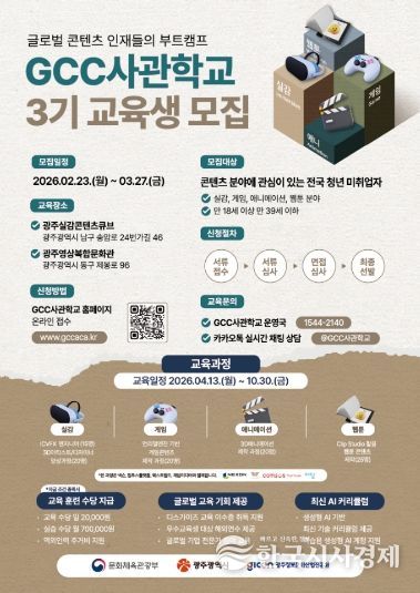 한국시사경제 광주취재본부 | 광주광역시는 문화콘텐츠 산업을 선도할 전문인력 양성을 위해 ‘GCC사관학교’ 3기 교육생 100명을 오는 3월27일까지 모집한다.