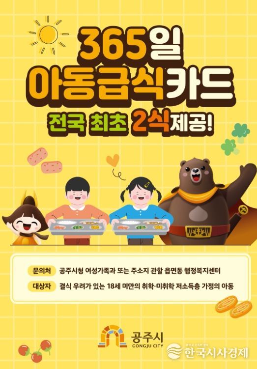 한국시사경제 문화팀 | 공주시는 전국 최초로 1년 365일 내내 결식 우려 아동에게 급식카드 1식을 추가 지원하는 사업을 추진한다고 4일 밝혔다.