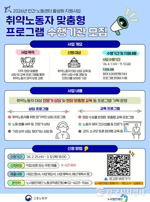 한국시사경제 문화팀 | 고용노동부 노사발전재단은 민간 노동센터·비영리단체 등이 지역별 특성과 취약노동자의 다양한 노동환경을 반영한 맞춤형 프로그램을 기획·운영할 수 있도록 '2026년 취약노동자 맞춤형 프로그램' 지원 사업을 추진한다고 밝혔다.