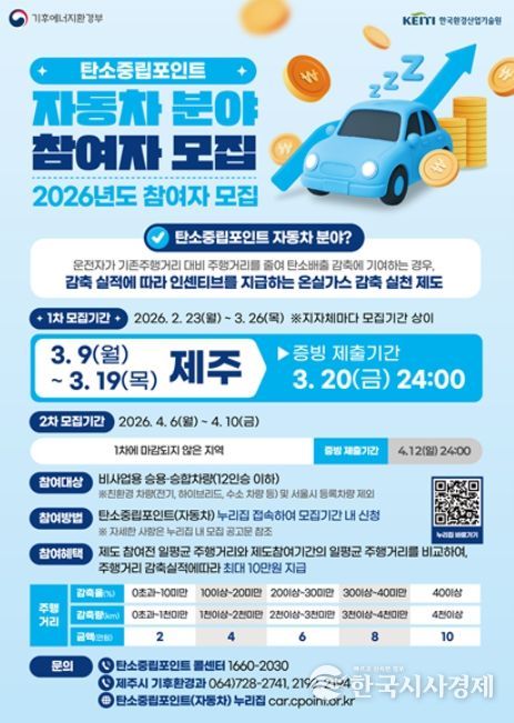 한국시사경제 사회팀 | 제주시는 온실가스 감축과 친환경 운전 문화 확산을 위해 ‘2026년 자동차 탄소중립포인트제’ 참여자를 모집한다.