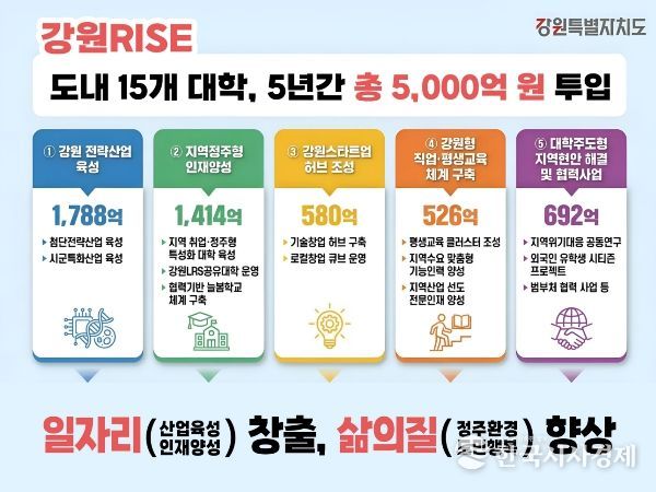 - 도는 ▲강원 전략산업 육성 1,788억 원 ▲지역 정주형 인재양성 1,414억 원 ▲강원 스타트업 허브 조성 580억 원 ▲강원형 직업‧평생교육 체계 구축 526억 원 ▲대학주도형 지역현안해결 및 협력사업 692억 원 등 5대 프로젝트를 중심으로 강원형 지역혁신 모델 구축을 추진하고 있다.