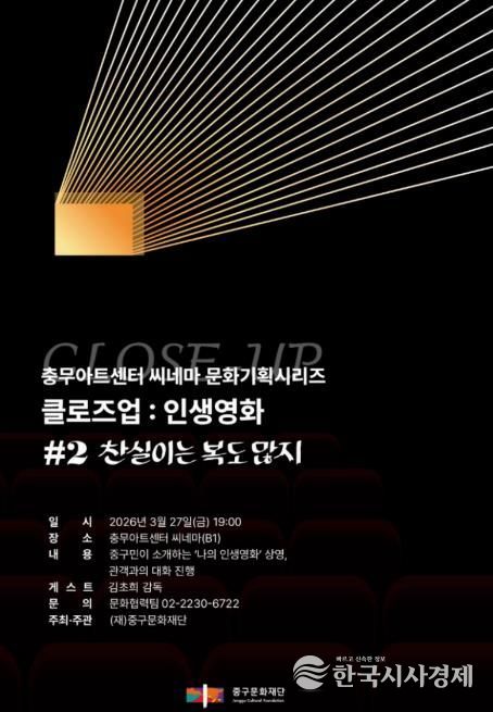 한국시사경제 권충언 기자 | 서울 중구문화재단은 오는 3월 27일, 충무아트센터 씨네마에서 중구민이 직접 ‘나의 인생영화’를 소개하고 영화감독과 함께 대화를 나누는 '클로즈업 : 인생영화'를 개최한다.