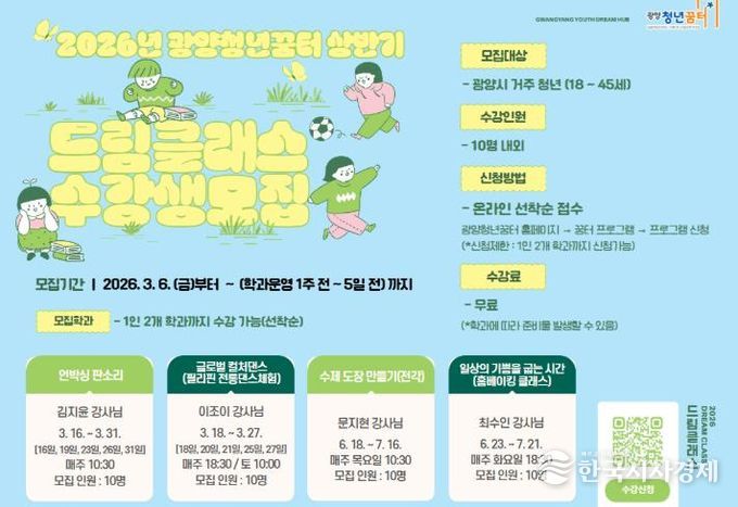 한국시사경제 권충언 기자 | 광양청년꿈터는 지역 청년이 직접 기획하고 운영하는 청년 주도형 학습 프로그램 ‘2026년 상반기 드림클래스’ 수강생을 모집한다고 밝혔다.