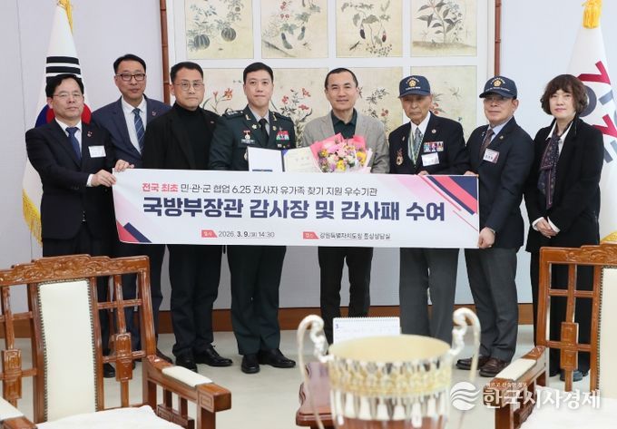 한국시사경제 권충언 기자 | 강원특별자치도는 국방부 유해발굴감식단이 추진한 ‘2025년 민·관·군 협업 6·25전사자 유가족 집중 찾기’ 사업에서 전국 최초 민관군 협업 6.25전사자 유가족 찾기 지원 우수기관으로 선정돼, 3월 9일 국방부장관으로부터 감사장과 감사패를 수상했다고 밝혔다.